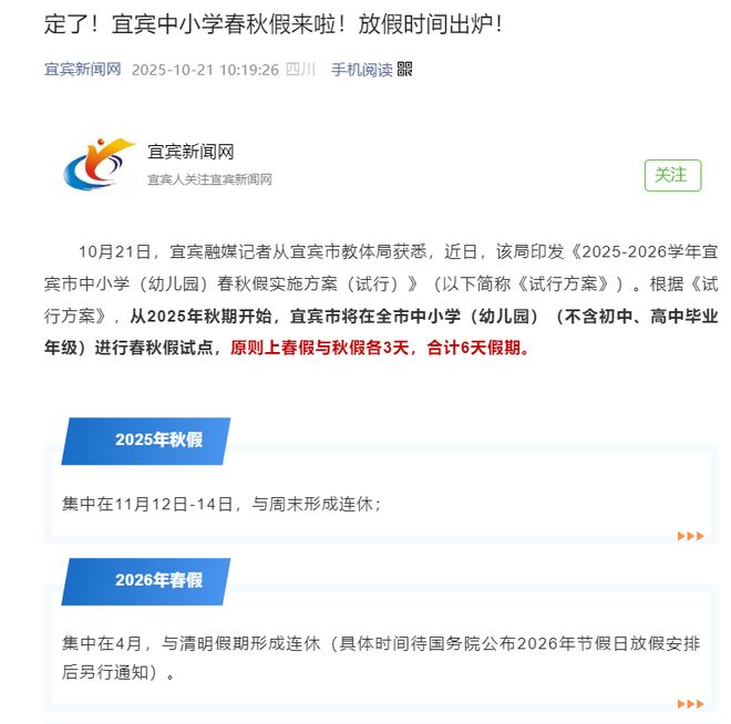 绵阳首个教育资讯及继续教育政策主要新闻解读!刚刚,宜宾、自贡宣布11月开始“春秋小长假”!秋季假期安排在11月12日至14日(周三至周五),周末可连续休5天。也就是说,再过半个月,宜宾、自贡的中小学生将再次迎来“小长假”! 10月21日,宜宾从宜宾市教育体育局获悉,该局印发了《宜宾市中小学(幼儿园)春秋放假“试行方案”实施方案》。根据《试行方案》,从2025年秋季开始,宜宾市将在全市中小学(幼儿园)开展春秋放假试点。 (不包括初中和高中成绩)。原则上,弹簧v平假、秋假各3天,共计6天。自贡放假范围:1-8年级 秋假时间:11月第二周周三至周五,3天 春假时间:五一假期前后,2天 从各地发布的通知来看,四川省宜宾、自贡等地宣布将在中小学实行“春秋双休”。最新的秋假安排在11月12日至14日,连接两个周末,形成为期五天的假期。浙江省的宁波、湖州、嘉兴、金华、台州、广东等地的春秋假期安排在11月12日至14日,连接两天周末,形成五天假期。那么,未来成都还会有学校实行“春秋假期”吗? 9月,有网友在麻辣社区留言询问中小学是否成都有计划实施春秋假期。 9月15日,成都市教育局回应称,高度重视并研究领先城市春秋假期的经验。据了解,全国仅有广东佛山、浙江杭州、湖北利川等少数城市对中小学实行放假和秋季,稳定2-3天。成都市中小学学生基数大、覆盖面广。在充分征求家长意见的基础上,中小学可考虑学生年龄特征、学阶段特点、学习活动、家长放假情况等。成都中小学未来是否有春秋假期,还需等待官方通知。那么,绵阳是否有学校实施“春秋两季”?9月17日,绵阳市教育体育局回应:我市目前正在研究春秋假期,至于后续,还需等待官方通知。确实,家长朋友们对于“春秋假期”是最反对的。在相关新闻评论区,不难看到不少家长的反对意见。家长们主要关心的是,“孩子们哪有时间和自己的孩子在一起”。 “孩子不放假怎么办?”放假期间作业可能会增多,甚至可能会安排额外的教学时间。“不仅孩子玩得不好,家长还要花更多的时间在教学和照顾上,增加了家庭的负担。”高年级的家长更担心孩子的学习和节奏分析会被打乱,无法专心做作业。此外,春秋两季的假期,一些家长也担心孩子的学习和节奏分析会被打乱。例如,各地在寒暑假期间放假,导致寒暑假休息时间较短。事实上,有效假期并没有增加。 》家长认为得不偿失。 反对的家长: 赞成的声音: 那么你对《春秋假期》怎么看? 来源:综合自网编辑:Helen 评论:David 如有违规,请联系我们删除删除: Helen 评论:David 如有违规,请联系我们删除: