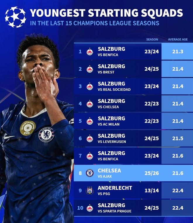 北京时间10月23日,切尔西在欧冠第三轮比赛中主场5-1击败10人应战的阿贾克斯。吉奥、莫伊塞斯·凯塞多、恩佐·费尔南德斯、埃斯特班和蒂里克·乔治分别进球。赛后,根据德专统计,本场比赛切尔西首发阵容的平均年龄仅为21.6岁,是近15个欧冠赛季中第八年轻的。近15个赛季欧冠最年轻首发阵容:1.萨尔茨堡红牛(对阵本菲卡)23-24赛季21.3岁2.萨尔茨堡红牛(对阵布雷斯特)24-25赛季21.4岁3.萨尔茨堡红牛(对阵皇家社会)23-24赛季21.4岁4.红牛萨尔茨堡(VS AC米兰)22-23赛季21.4岁6.红牛 萨尔茨堡 (VS 勒沃库森) 24-25 赛季 21.5 岁 7. 萨尔茨堡红牛 (VS 本菲卡) 23-24 赛季 21.6 岁 8. 切尔西 (VS 阿贾克斯) 25-26 赛季 21.6 岁 9. 22.4 岁 10. 萨尔茨堡红牛 (VS 布拉格斯巴达) 24-25 赛季22.4岁 切尔西 vs 阿贾克斯 首发阵容:菲利普·乔根森(23 岁); Moises Caicedo(23岁)、Wesley Fofana(24岁)、Adarabioyo(28岁)、Hutto(19岁);法昆多·博纳诺特(20 岁)、拉维亚(21 岁)、恩佐·费尔南德斯(24 岁);埃斯·图万(18岁)、吉奥(19岁)、比诺伊·吉滕斯(21岁) 北京时间10月23日,萨尔茨堡红牛队在欧冠第三轮比赛中,切尔西主场5-1击败10人阿贾克斯。吉奥、莫伊塞斯·凯塞多、恩佐·费尔南德斯、埃斯特班和泰里克·乔治分别进球。赛后,根据德专统计,本场比赛切尔西首发阵容的平均年龄仅为21.6岁,是近15个欧冠赛季中第八年轻的。近15个赛季欧冠联赛最年轻首发阵容:1.萨尔茨堡红牛(对阵本菲卡)23-24赛季21.3岁2.萨尔茨堡红牛(对阵布雷斯特)24-25赛季21.4岁3.萨尔茨堡红牛(对阵皇家社会)23-24. 萨尔茨堡红牛 (VS AC 米兰) 22-23 赛季 21.4 岁 6. 萨尔茨堡红牛 (VS 勒沃库森) 24-25 赛季 21.5 岁 7. 萨尔茨堡红牛 (VS 本菲卡) 23-24 赛季 21.6 岁 8. 切尔西 (VS 阿贾克斯) 25-26 赛季21.6岁9.安德莱赫特(vs巴黎 圣日耳曼)13-14赛季22.4岁10.萨尔茨堡红牛(VS布拉格斯巴达)24-25赛季22.4岁切尔西vs阿贾克斯首发阵容:菲利普·约根森(23岁); Moises Caicedo(23岁)、Wesley Fofana(24岁)、Adarabioyo(28岁)、Hutto(19岁);法昆多·博纳诺特(20 岁)、拉维亚(21 岁)、恩佐·费尔南德斯(24 岁);埃斯·图万(18岁)、吉奥(19岁)、比诺伊·吉腾斯(21岁)北京时间10月23日,萨尔茨堡红牛队在欧冠第三轮比赛中主场5-1击败10人应战的阿贾克斯。吉奥、莫伊塞斯·凯塞多、恩佐·费尔南德斯、埃斯特班和泰里克·乔治分别进球。据赛后报道德专统计,本场比赛切尔西首发阵容的平均年龄仅为21.6岁,是近15个欧冠赛季中第八年轻的。近15个赛季欧冠最年轻首发阵容:1.萨尔茨堡红牛(对阵本菲卡)23-24赛季21.3岁2.萨尔茨堡红牛(对阵布雷斯特)24-25赛季21.4岁3.萨尔茨堡红牛(对阵皇家社会)23-24赛季21.4岁4.红牛萨尔茨堡(VS AC米兰)22-23赛季21.4岁6.红牛 萨尔茨堡 (VS 勒沃库森) 24-25 赛季 21.5 岁 7. 萨尔茨堡红牛 (VS 本菲卡) 23-24 赛季 21.6 岁 8. 切尔西 (VS 阿贾克斯) 25-26 赛季 21.6 岁 9. 22.4 岁 10. 萨尔茨堡红牛 (VS 布拉格斯巴达) 24-25 赛季22.4岁 切尔西 vs 阿贾克斯 首发阵容:菲利普 乔根森(23岁); Moises Caicedo(23岁)、Wesley Fofana(24岁)、Adarabioyo(28岁)、Hutto(19岁);法昆多·博纳诺特(20 岁)、拉维亚(21 岁)、恩佐·费尔南德斯(24 岁);埃斯·图万(18岁)、吉奥(19岁)、比诺伊·吉滕斯(21岁) 北京时间10月23日,萨尔茨堡红牛队在欧冠第三轮比赛中,切尔西主场5-1击败10人阿贾克斯。吉奥、莫伊塞斯·凯塞多、恩佐·费尔南德斯、埃斯特班和泰里克·乔治分别进球。赛后,根据德专统计,本场比赛切尔西首发阵容的平均年龄仅为21.6岁,是近15个欧冠赛季中第八年轻的。 Nangfirst近15个赛季欧冠最年轻首发阵容:1.萨尔茨堡红牛(VS本菲卡)23-24赛季21.3岁2.萨尔茨堡红牛(VS布雷斯特)24-25赛季21.4岁3.萨尔茨堡红牛(VS皇家社会)23-24赛季21.4岁4.红牛萨尔茨堡 (vs 切尔西) 22-23 赛季 21.4 年 老 5. 萨尔茨堡红牛 (vs AC 米兰) 22-23 赛季 21.4 岁 6. 萨尔茨堡红牛 (VS 勒沃库森) 24-25 赛季 21.5 岁 7. 萨尔茨堡红牛乌格(vs本菲卡)23-24赛季21.6岁8.切尔西(vs阿贾克斯)25-26赛季21.6岁9.安德莱赫特(vs巴黎圣日耳曼)13-14赛季22.4岁10.阿贾克斯首发阵容:菲利普·约根森(23岁); Moises Caicedo(23岁)、Wesley Fofana(24岁)、Adarabioyo(28岁)、Hutto(19岁);法昆多·博纳诺特(20 岁)、拉维亚(21 岁)、恩佐·费尔南德斯(24 岁);埃斯·图万(18岁)、吉奥(19岁)、比诺伊·吉滕斯(21岁) 北京时间10月23日,萨尔茨堡红牛队在欧冠第三轮比赛中,切尔西主场5-1击败10人阿贾克斯。吉奥、莫伊塞斯·凯塞多、恩佐·费尔南德斯、埃斯特班和泰里克·乔治分别进球。赛后,根据德专统计,本场比赛切尔西首发阵容的平均年龄仅为21.6岁,是近15个欧冠赛季中第八年轻的。近15个赛季欧冠最年轻首发阵容前10名:1.萨尔茨红牛urg (vs 本菲卡) 23-24 赛季 21.3 岁 2. 萨尔茨堡红牛 (vs 布雷斯特) 24-25 赛季 21.4 岁 3. 萨尔茨堡红牛 (vs 皇家社会) 23-24 赛季 21.4 岁 4. 萨尔茨堡红牛 (VS AC 米兰) 22-23 赛季 21.4 岁 6. 萨尔茨堡红牛(VS勒沃库森)24-25赛季21.5岁 7. 萨尔茨堡红牛(vs 本菲卡) 23-24 赛季 21.6 岁 8. 切尔西(vs 阿贾克斯) 25-26 赛季 21.6 岁 9. 22.4 岁 10. 萨尔茨堡红牛(vs 布拉格斯巴达) 24-25 赛季 22.4 岁 切尔西 vs 阿贾克斯 首发阵容: 菲利普·约根森(23 岁);莫伊塞斯·凯塞多(23岁)、韦斯利·福法纳(24岁)、阿达拉比奥尤(28岁)、胡托(19岁);法昆多·博纳诺特(20 岁)、拉维亚(21 岁)、恩佐·费尔南德斯(24 岁);北京时间10月23日,埃斯特万(18岁)、吉奥(19岁)、比诺伊·吉腾斯(21岁)萨尔茨堡