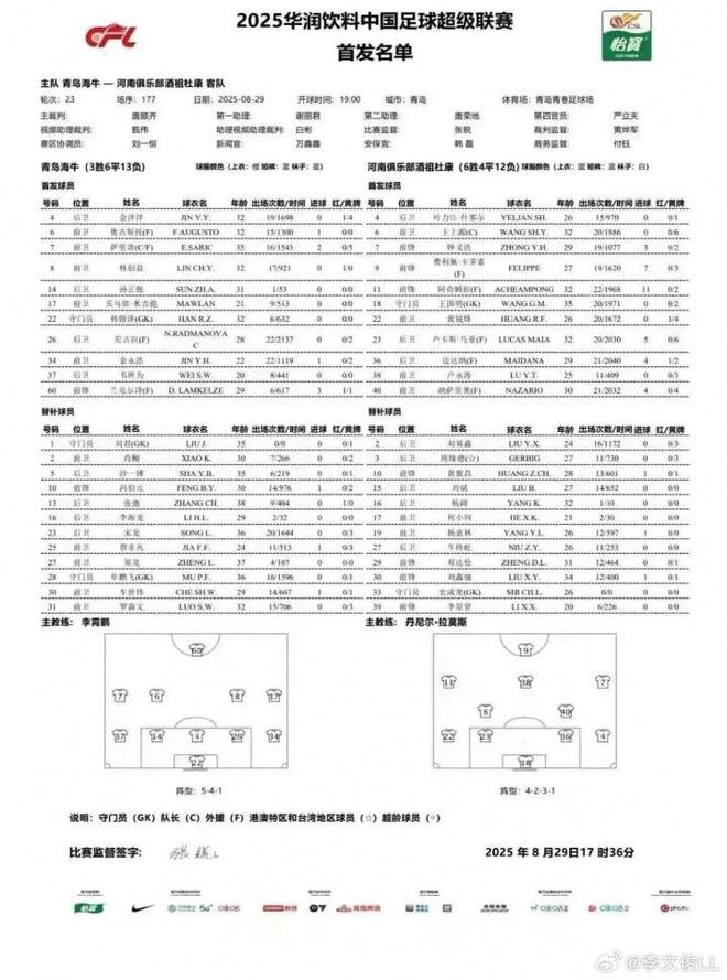 8月29日直播。中国超级联赛的第23届,金迪奥·海尼奥vs henan。宣布比赛前的起跑线。青岛海牛首次发射:22-Han Rong